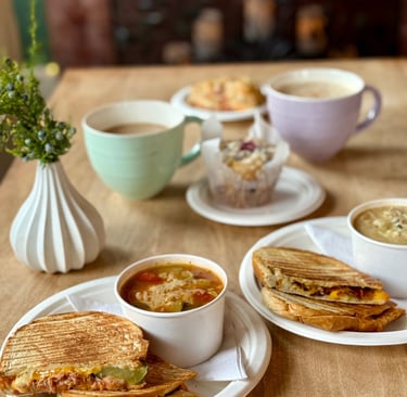 An inviting, relaxing ambiance awaits. Grab a spot at a cafe style table, a larger round table or relax on the sofa as the delightful smells of homemade soup and desserts waffle in the air.